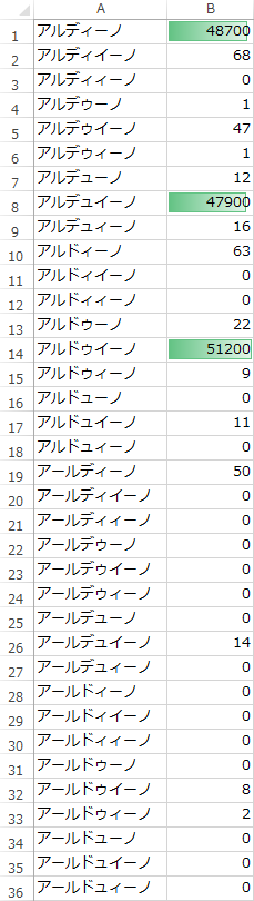 結果は次の3強みたいですね。0件の結果も多数あります。「ィィ」など日本語として通常表記しない組み合わせも発生するので、そこまで表記ゆれはないようです。