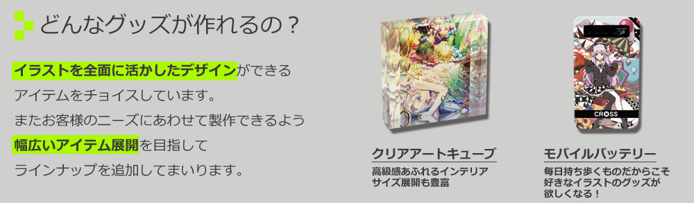 株式会社そらゆめ運営の「CROSS クラウドファンディング」をベースとした、グッズ製作から販売まで行える「CROSS ICHI」が、近日オープンするとのこと! イラストのアップロードにより手軽にオリジナルグッズ作れて販売できるオンラインショッピング系のサービスです。