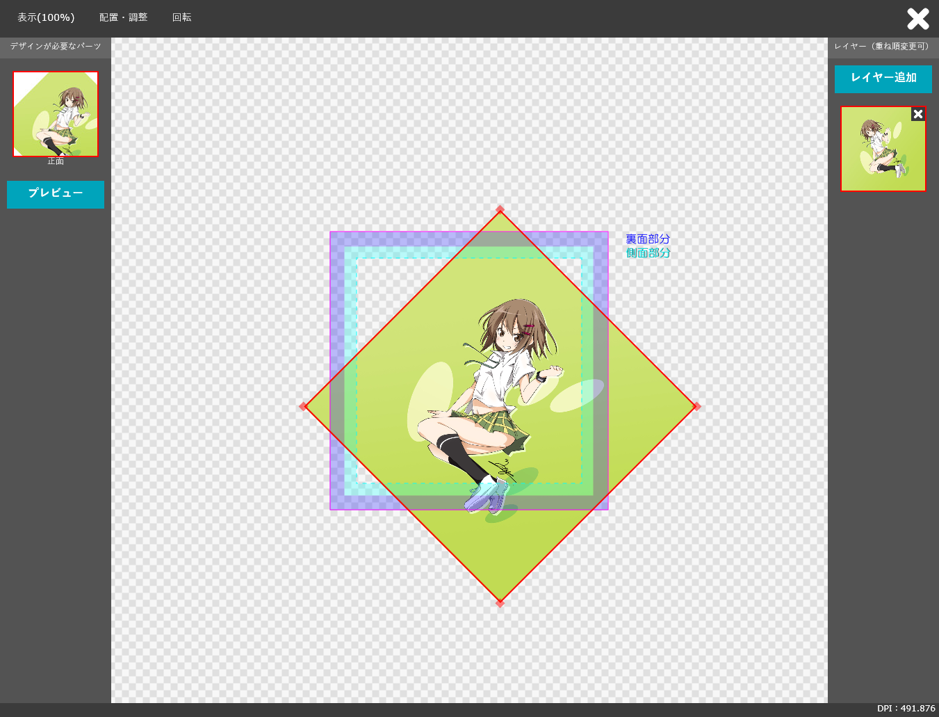 キャンバスアートのレイアウト画面です。回転やレイヤーの追加なども可能ですが、オフラインできちんとデザインした方が確実かと思います。