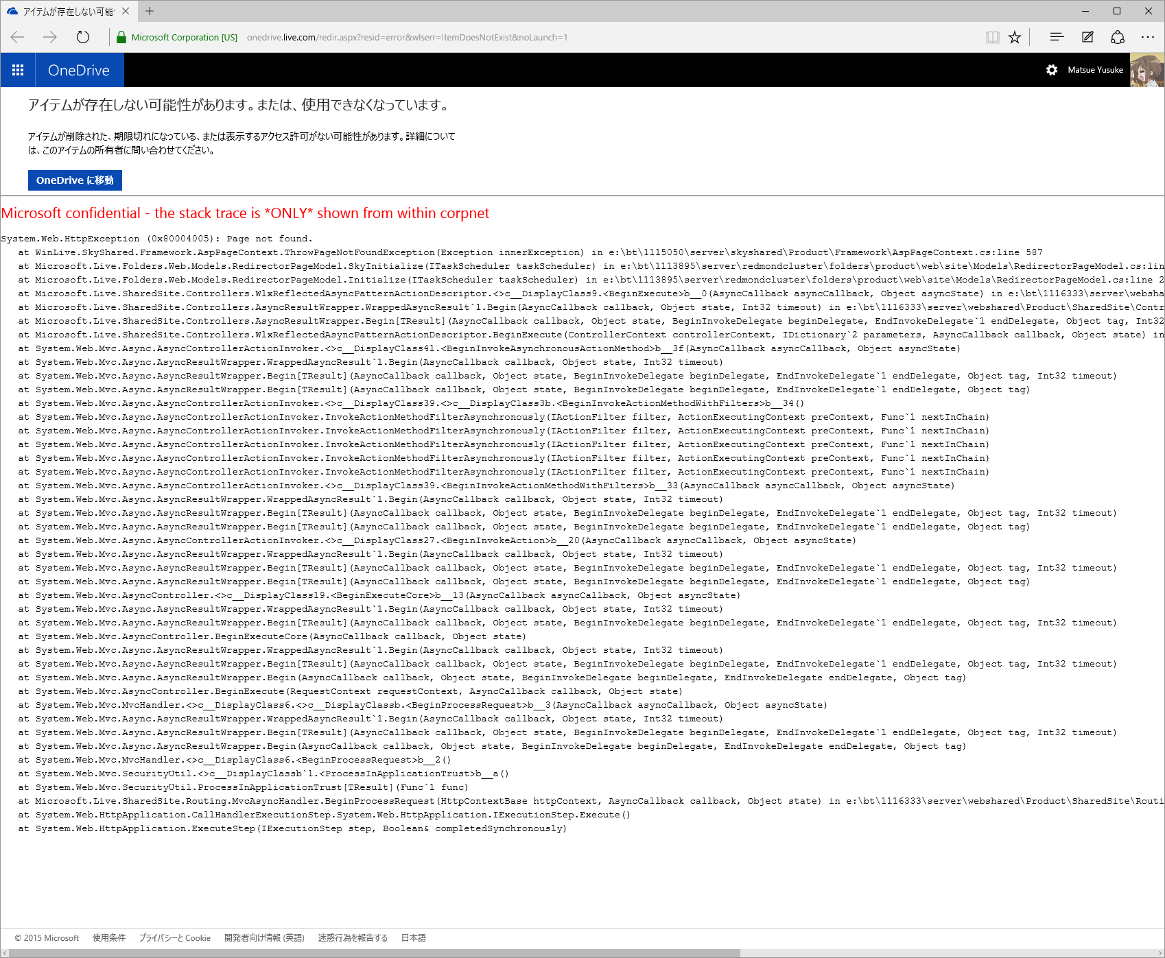 OneDrive で Microsoft confidential を偶然目にしました。といっても極秘文書がアップロードされてたというわけではなく、デバッグ用に Stack Trace のログが表示されるという内容です。