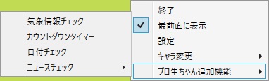 プロ生ちゃんのデスクトップマスコットは、ときどきプロ生ちゃんが話す以外に、気象情報チェック、タイマー、日付チェック、ニュースチェック機能が用意されています。