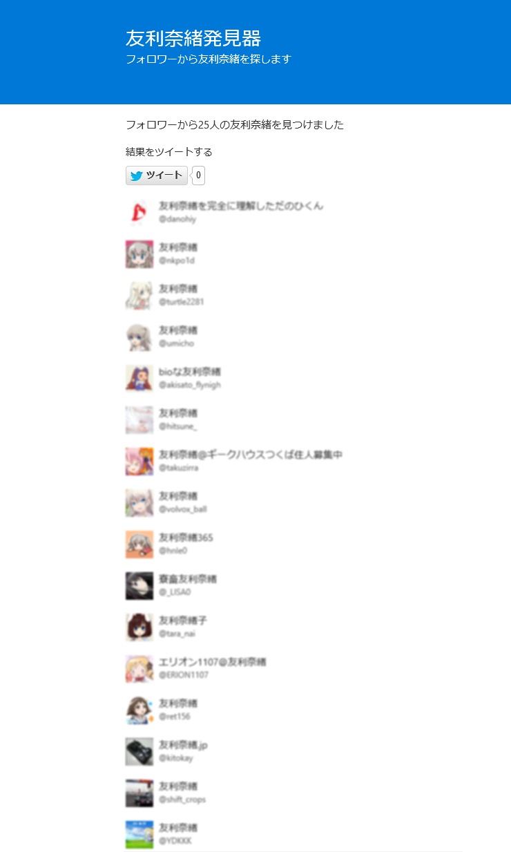 先日の「フォロワーから友利奈緒を探す」を、Web サービス化しました。