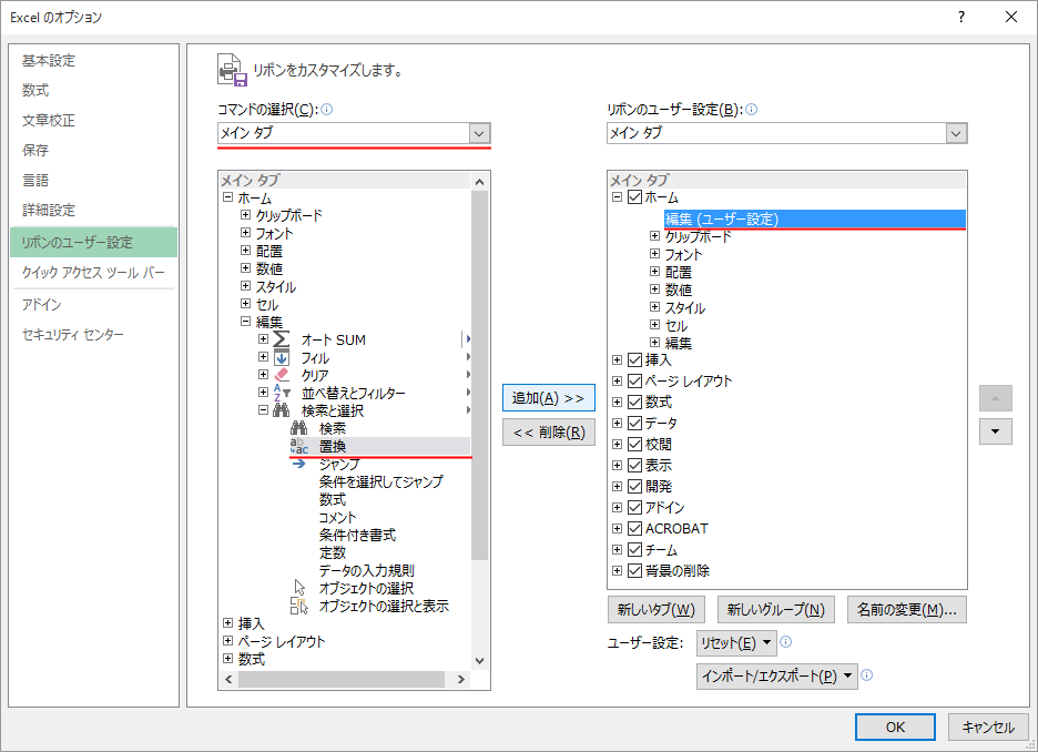 ちなみに、あらかじめ用意されているコマンドのセットは、編集できないため(まとめてリボンから削除は可能)、リボンに元からある「検索と選択」内の「置換」コマンドの名前変更やコマンドの差し替えはできません。