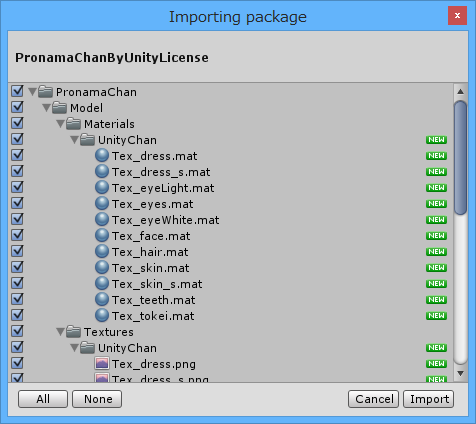 Package の内容がダイアログで表示されるので、Import ボタンを押してインポートします。Package にはプロ生ちゃんの FBX 版モデルデータ、それを利用したプレハブデータなどが含まれています。