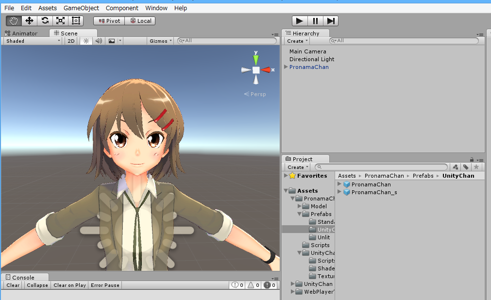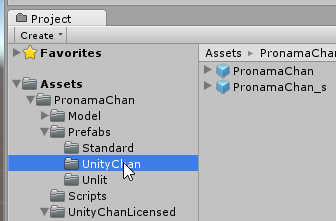 Project ビューで、PronamaChan > Prefabs > UnityChan を展開すると、PronamaChan、PronamaChan_s のプレハブが入っています。