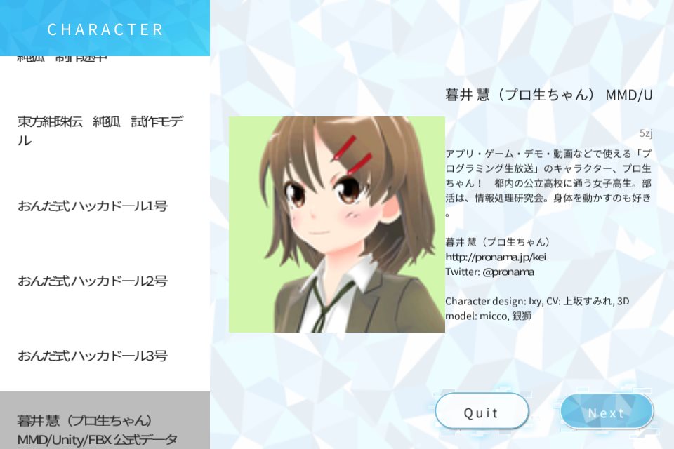 アプリを起動するとキャラクターが選択できます。キャラクターは、アプリの推奨モデルとニコニ立体の作品モデルに分類されています。現時点で選べるキャラクターは次の通り。