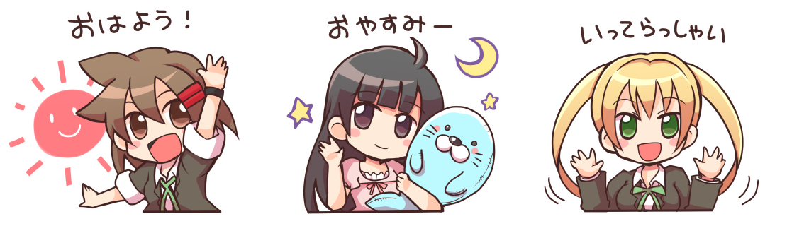 ささくらさんによるかわいいアイコンの新作が登場! 情報処理研究会のメンバー3人組、慧・千由莉・フィネスのメッセージ付きアイコンです。アイコンは、SNS のアイコンとしてや、アプリや動画の作品などに使えます。