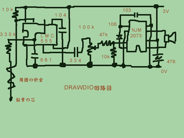 今回用意したアイテムは、ドローディオ(Drawdio)といいます。これは私のオリジナルじゃなくて、マサチューセッツ工科大学 メディア研生涯幼稚園団のジェイ・シルバー様の成果をもとにクリエイティブコモンズライセンスで紹介されている回路です。原文では、"DRAWDIO is based on work by Jay Silver in the Lifelong Kindergarten group at the MIT Media Lab." を明記するようにと案内されてます。