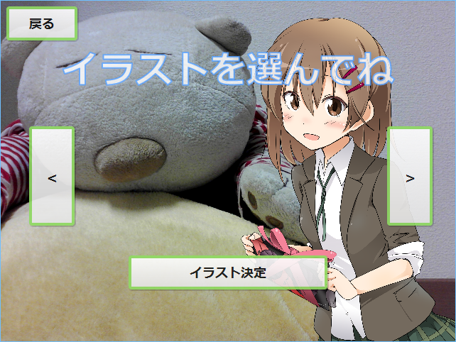 タイトル画面で「スタート」を押下すると、イラストの選択画面になります。 「<」と「>」でイラストを選択します。