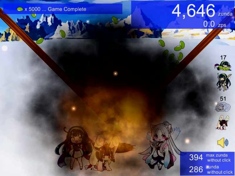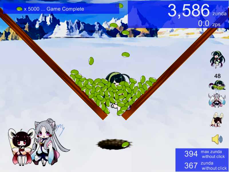 「ずんだ餅クリッカー」はずんだ餅をクリックして落とすゲームです。落としたずんだ餅の数でずん子ちゃん達のスキルが解放され、ずんだ餅の詰まりを解消できます。「東北ずん子」「東北きりたん」「東北イタコ」が登場します。