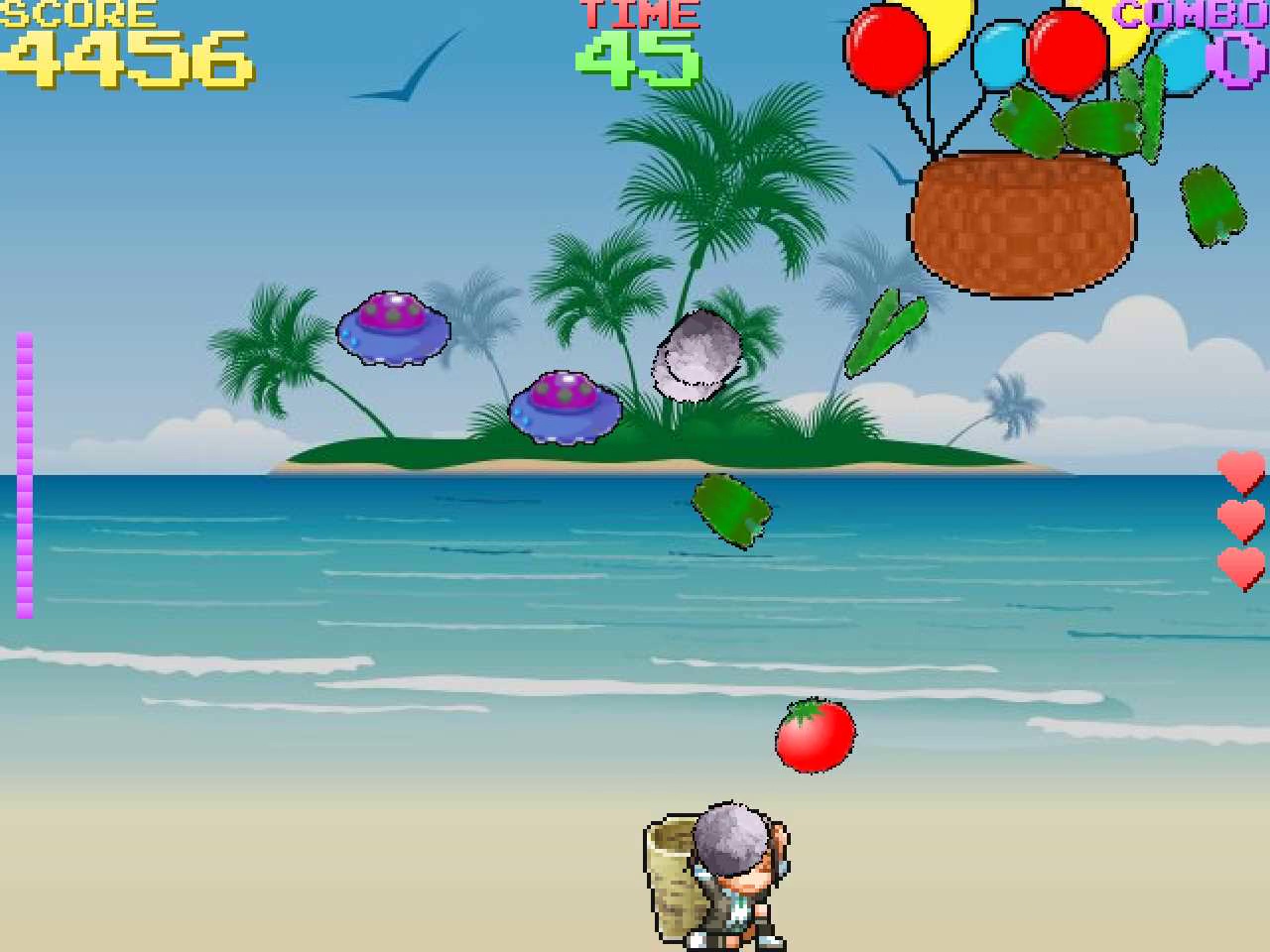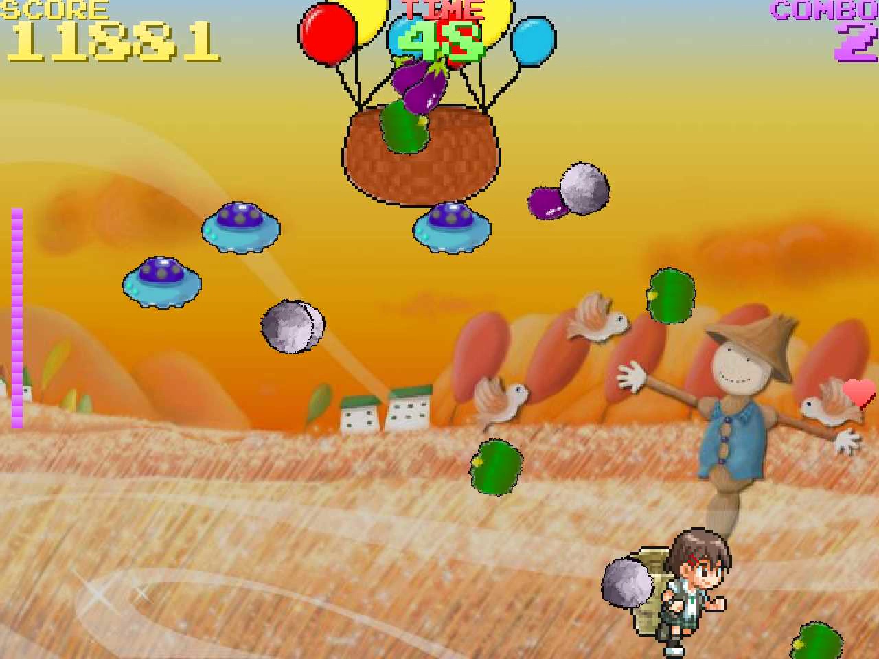 野菜に紛れて UFO が岩を落としてきます。岩に当たってしまうと、ダメージを受けてしまい、画面右のライフが0になったらゲームオーバー。スコアが5万点、10万点でライフが1回復、最大で5個までキープできます。