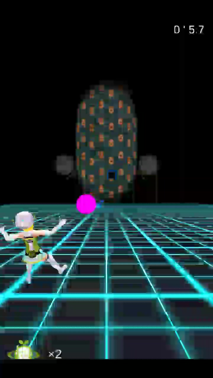 敵ウイルスとスクラップデータは見た目は同じなのですが、色で判別できるようになっています。緑はスクラップデータ、青とオレンジが攻撃対象、白色の十字や丸のオブジェクトは障害物です。