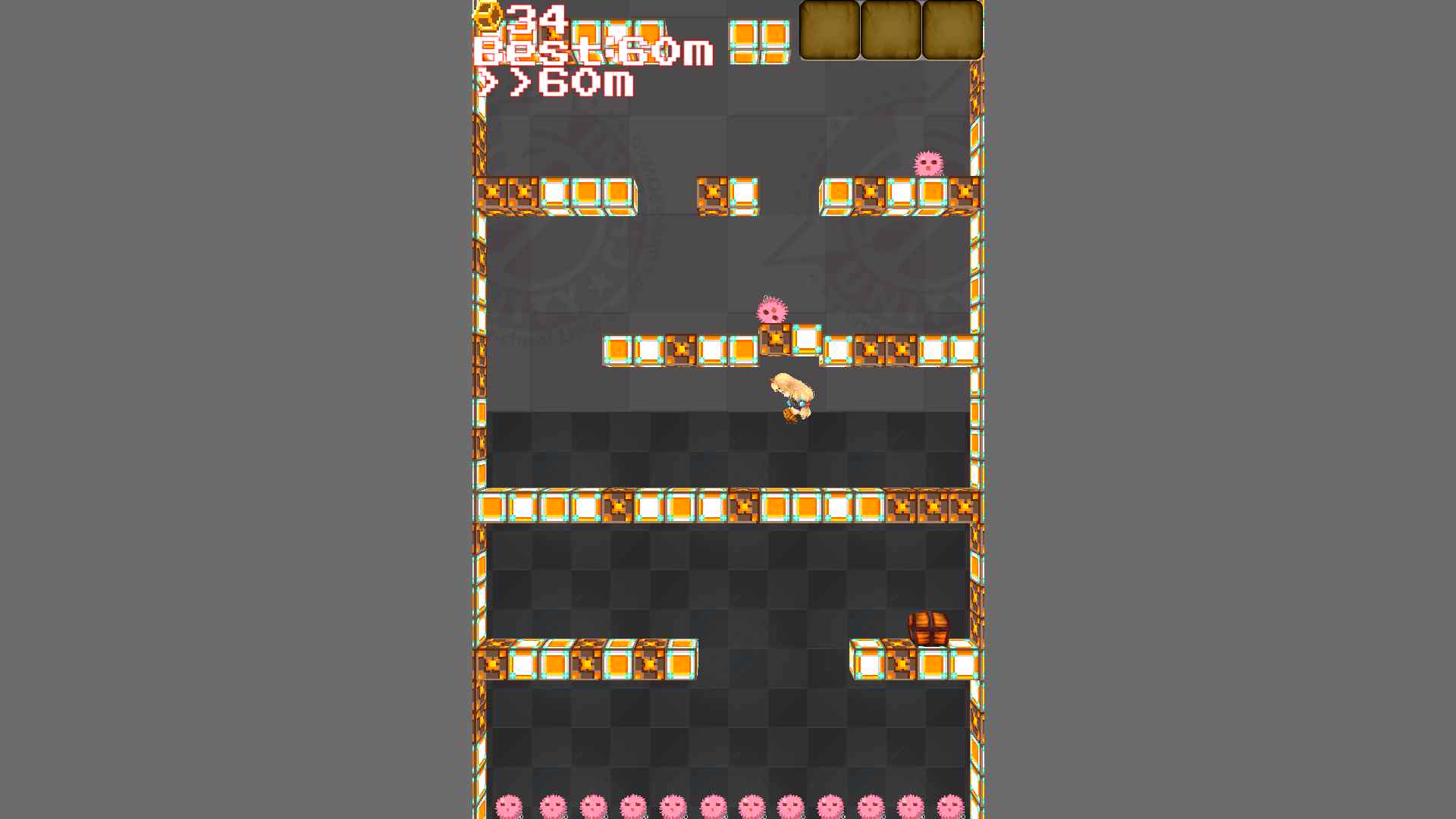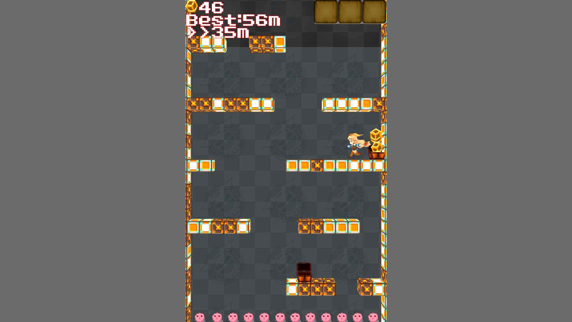 途中には宝箱があり、下から叩くか歩いて触れると中からコインが出てきます。コインを集めるとコンティニューができ、ミニゲームでアイテムの入手もできるので、集めておきましょう。