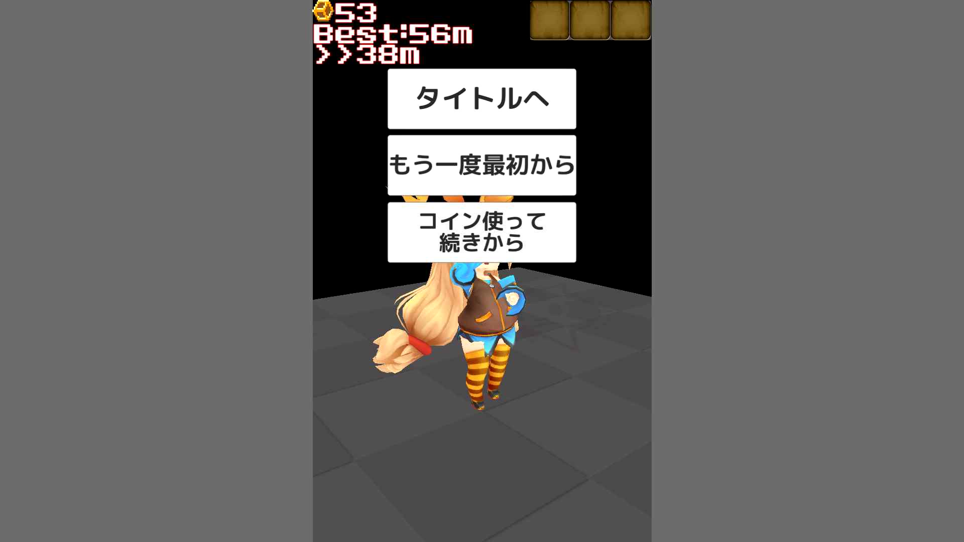 コインは上に進んでいくと入手量が増えていくので、状況に合わせてコンティニューを利用すると稼ぎやすいです。下に落ちてしまうか、敵に触れるとゲームオーバーになるので、コンティニューかまた最初からプレイするか選択します。