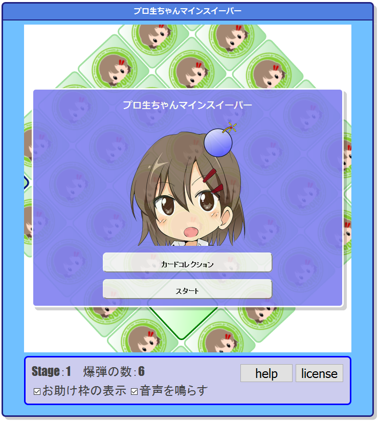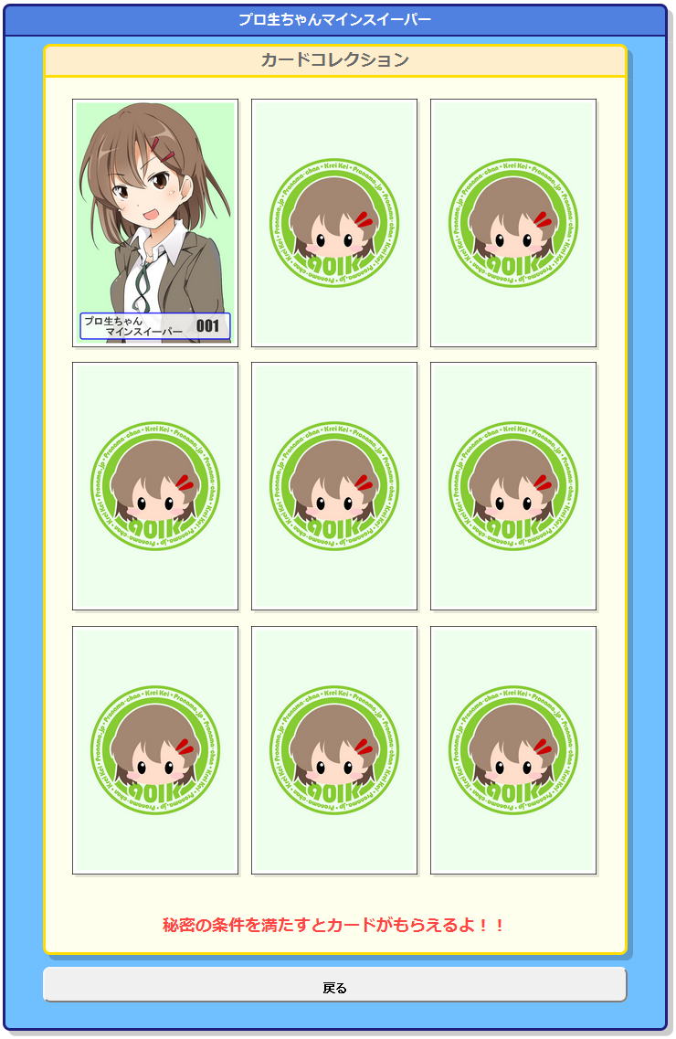 また、特定の条件をクリアするとカードがもらえるのでカードをコレクションして楽しめます。 プロ生ちゃんマインスイーパーは、HTML5 で作成しているので、PC でもスマートフォンでも遊べます。