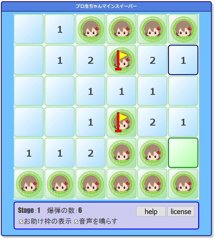 「プロ生ちゃんマインスイーパー」は、ルールは普通のマインスイーパーと同じですが、プロ生ちゃんのイラストと音声を使うことで、かわいい感じのマインスイーパーになっています。