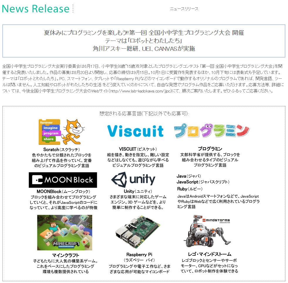 角川アスキー総研、UEI、CANVAS によるアプリコンテスト「第一回 全国小中学生プログラミング大会」開催が発表されています。