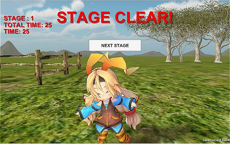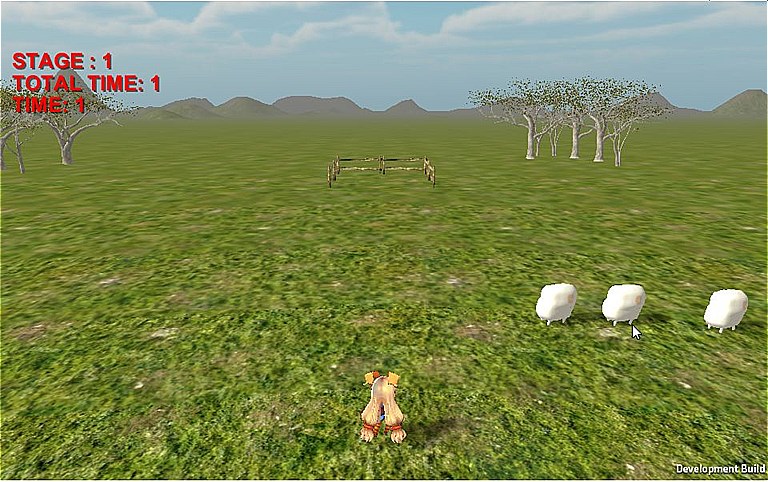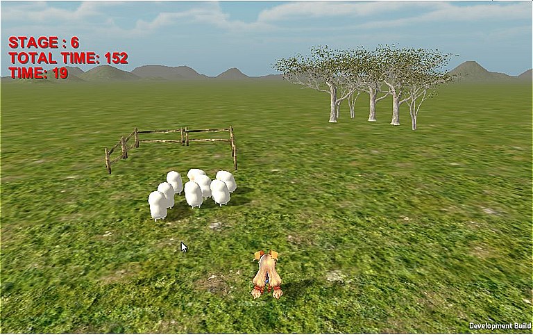 まずゲームを開始すると、三匹の羊がフィールド内をうろついています。ユニティちゃんを操作して羊に近づいていくと、ユニティちゃんの反対側にむかって逃げていくので、逃げる方向をうまく誘導して柵の中に追い込むとクリアです。ステージ数は全6面、1つクリアするごとに羊の数が一匹ずつ増えていきます。
