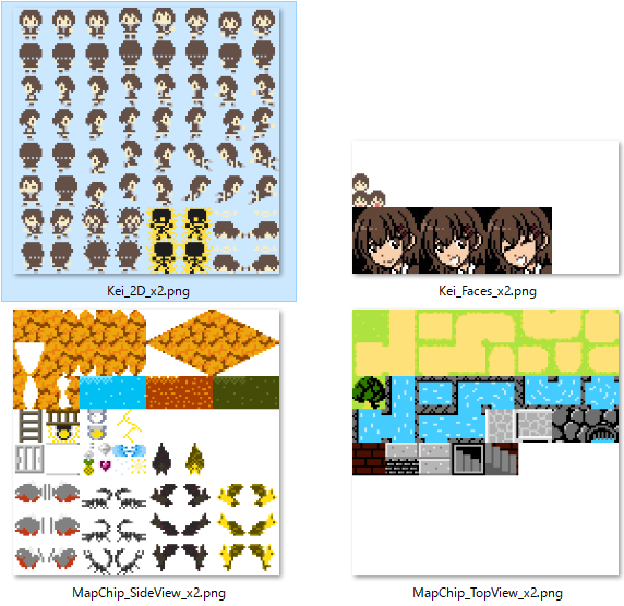 プロ生ちゃんの多数のパターンに加え、マップや敵に使えるドット絵も含まれています。