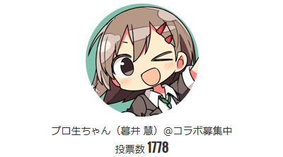 プロ生ちゃんに投票いただいた皆さんありがとうございました。最終結果は 1778票 でした! 企業キャラ部門では7位ぐらいだったみたいです。