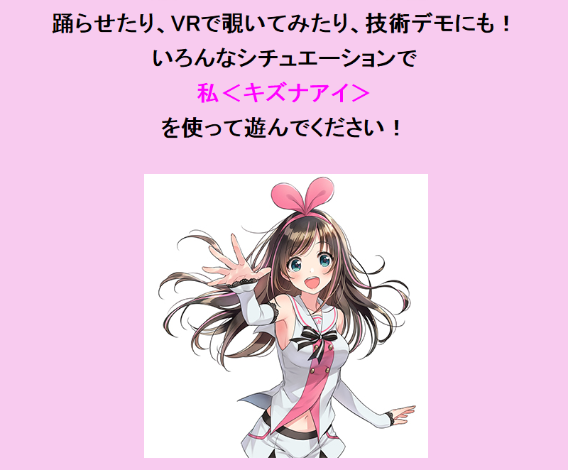 バーチャルユーチューバー「キズナアイ (Kizuna AI)」の技術デモや二次創作に使える MikuMikuDance (MMD) 向け 3D モデルが無料公開されています。