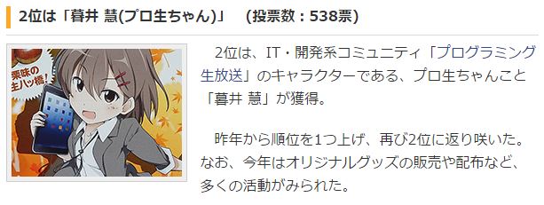 「アキバで見かけた萌えキャラコンテスト 2016」プロ生ちゃんは2位