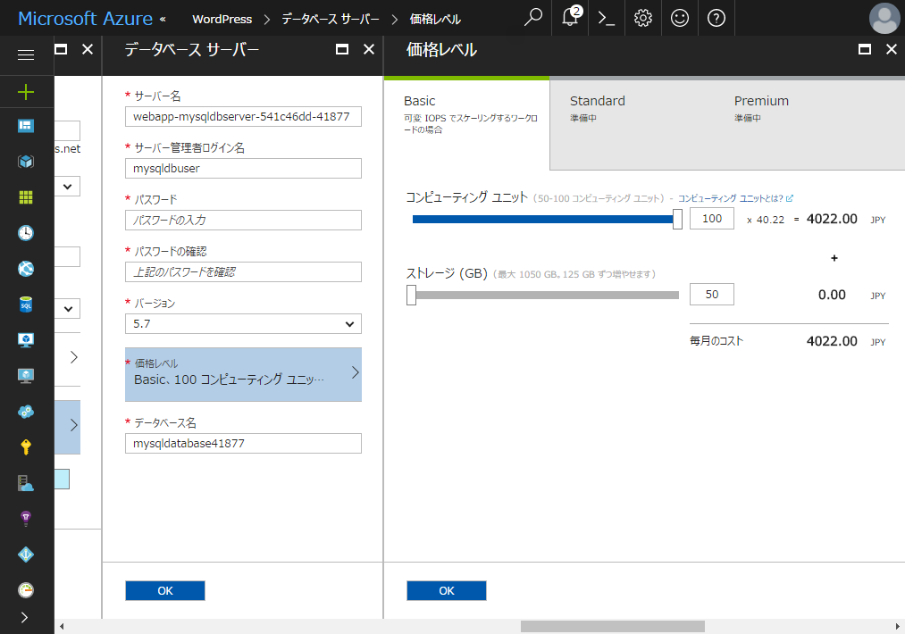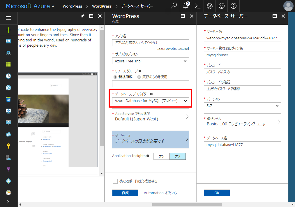 Azure Portal から新規に WordPress を Web App 上に作る場合、Database for MySQL を選べるようになっています。