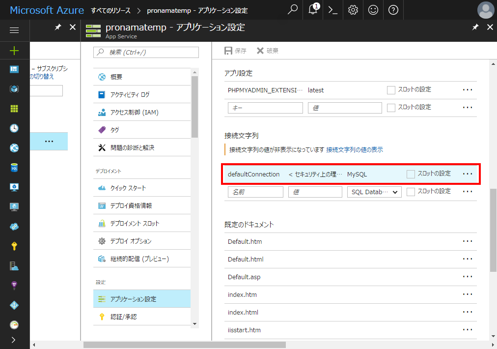 データベースへの接続文字列は Web App のアプリケーション設定で指定しています。接続文字列は次のような値が設定されています。