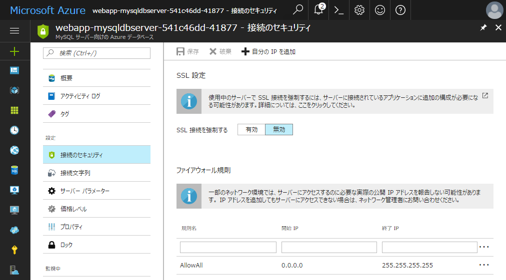Azure Database for MySQL だけ新規に作ると、SSL 有効・ファイヤーウォール有効のため、既存の WordPress から接続するときは注意です。