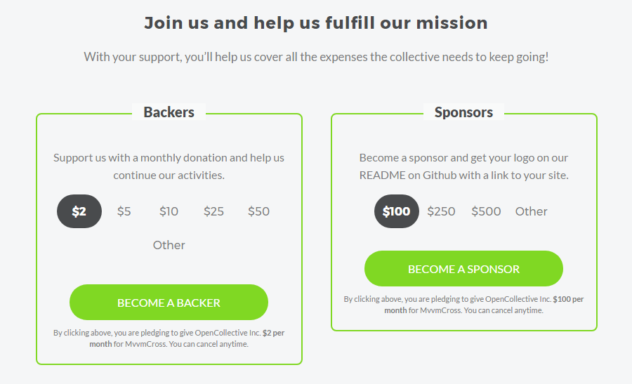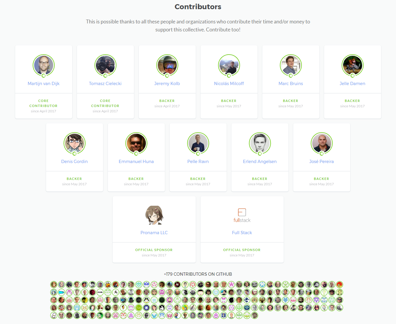 Bakers(後援者)・Sponsors(スポンサー)と別れていますが、違いは金額です。最低100ドルからスポンサー扱いとなり、Collective ページでスポンサーロゴ(プロフィールページの画像)の表示と Web サイトへリンクされます。Backer の場合はプロフィールアイコンの表示とプロフィールページへのリンクです。