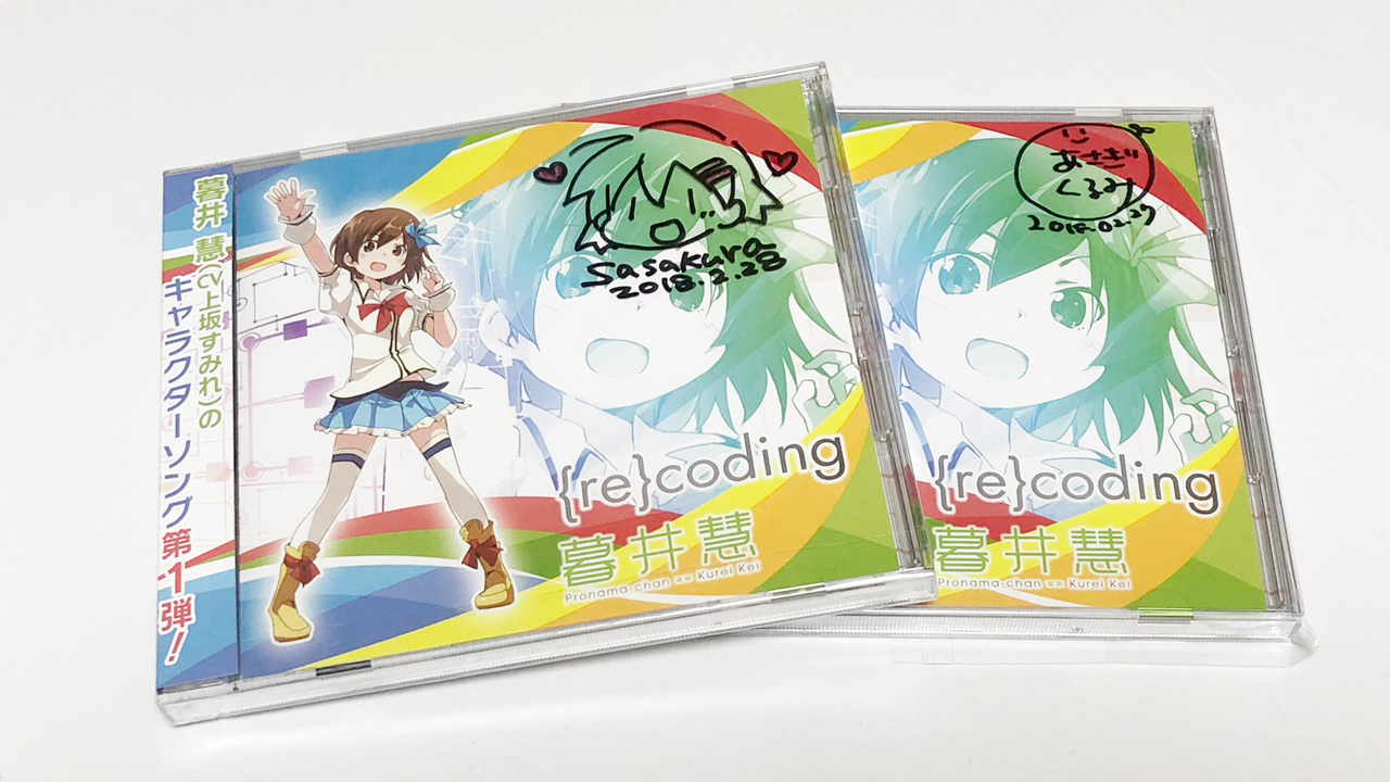 暮井 慧(CV 上坂すみれ)のキャラクターソング「{re}coding」のジャケットを手掛けた「イラストレーターのサイン入りの CD と缶バッジのセット」をオリオスペックで販売します! 少数ですので、ほしい方はお早めに。