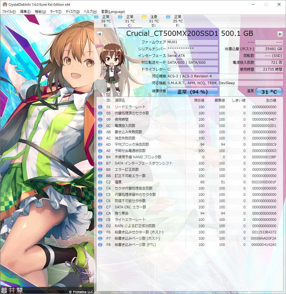 3/22、CrystalDiskInfo 7.6.0 がリリースされています。Kurei Kei Edition Ultimate は、暮井 慧(CV 上坂すみれ)のキャラクターソング「{re}coding」のジャケットイラスト2枚が追加されています。また、前バージョンで表示できないテーマイラストが1枚あったのですが、表示できるよう修正されています。