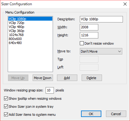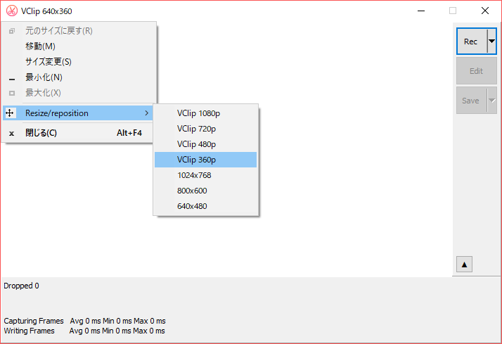 Sizer で VClip のウィンドウを 640×480 などに変更します。すると、録画範囲の大きさとの差分がわかるので、その差分を加えた YouTube の推奨サイズ を Sizer の設定に登録します。