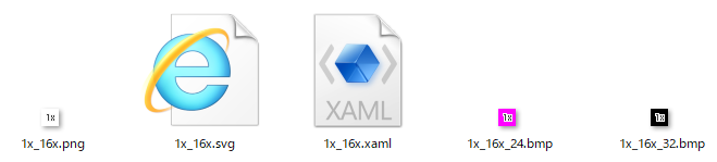 Visual Studio 2017 アイコンの場合、SVG, XAML 形式と 16×16ドットの PNG 形式のファイルがあるようです。アイコンにより別形式のファイルや、デザインにバリエーションがあります。