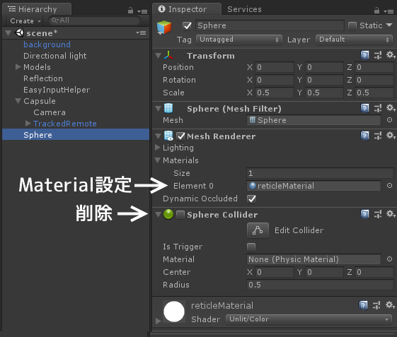 - Material を Easy Input for Gear VR/Media フォルダーの reticleMaterial に設定。