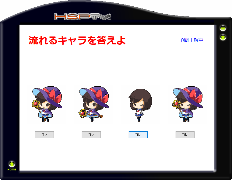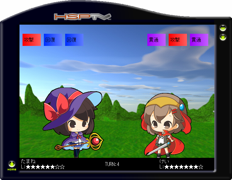 HSP3.51 プロ生ちゃんエディション の珠音ちゃんとのコラボ新素材を活用した作品! はじめに攻撃や防御のパターンを組んで、自動で進む攻防を楽しむゲームだね。戦闘アニメーションもいい感じ。選んだ攻防パターンは、先頭から3個のうちランダムで選ばれる運要素があって、それを見越したパターンを考えたり結構 奥深いかも?