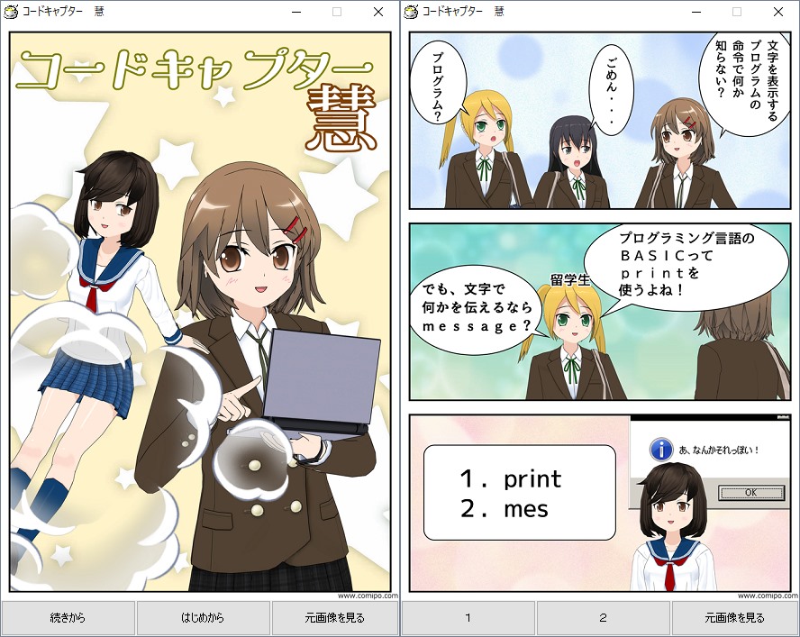 電子の世界から来た珠音ちゃんと一緒に、パソコンから逃げ出したコードを集めるストーリーのゲームブック! 2017年の応募作品 簡易ゲームブックプレーヤー をアップデートして、さらに今回は「コミPo!」も活用したオリジナルの漫画で楽しく遊べる応募作品になってるよ👍