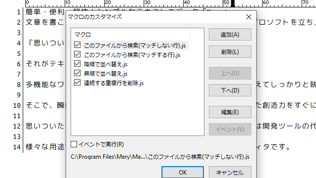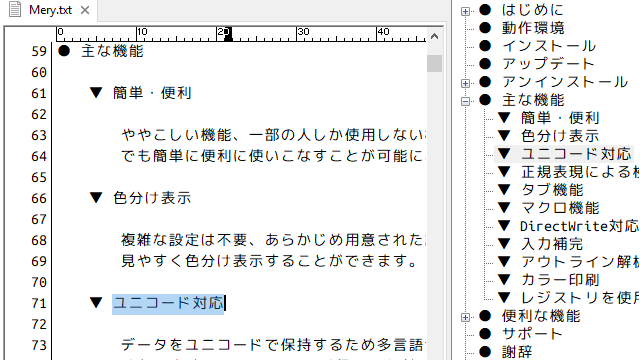 Mery はシンプルなテキストエディタだけど、マクロ機能、検索機能、アウトライン機能、縦書き機能、その他多くの便利な機能を備えている、簡単な操作ですぐに使える形がポイントだね。