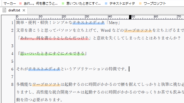 選択した文章や単語に色を塗ることができるマーカー機能は、重要箇所への色付け、表記ゆれのチェック、ソースコードの変数の強調などに使えるよ。