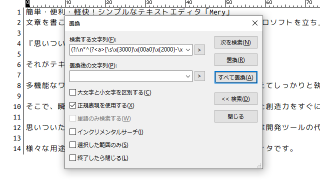 初心者でもすぐに使えるように、検索・置換の画面の [>] ボタンから正規表現のテンプレートが呼び出せるようになっているから、「なんだか難しそう」と閉じてしまう前にとりあえず触れてみるといいかも。