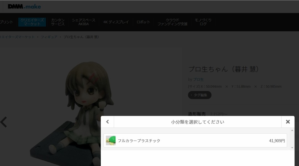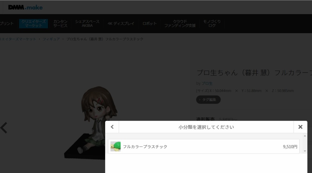 プロ生ちゃんフィギュアの同じデータをアップロードすると、フルカラープラスチックのプリント代は41,900円が9,510円とかなり安くなりました。というか知らずに高い金額の方でプリントしてしまったらショックですね……。