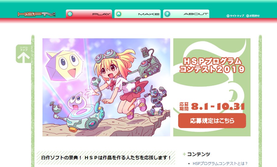HSP プログラミングコンテストは、プログラミング言語「HSP」を使った作品を募集して表彰するイベントです。16年の長い歴史を持ち、すべての応募作品は無料でダウンロード公開されています。作品を見てみたいという人も大歓迎。 HSP を使っている人も、そうでない人も自由に参加して楽しむことができます。