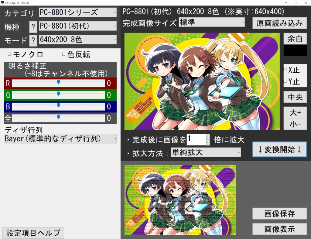 このソフトは、お手持ちの画像ファイルを、今から40年~20数年前のレトロPC風のものに変換するソフトです。
