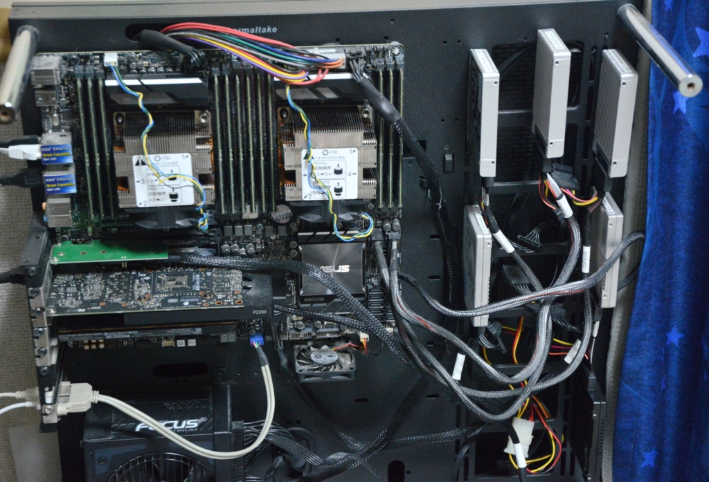 キリナシ オリオスペックさんで、あるみさんパネルを購入できたので、それから、パネルを使うためのケース(Core P5)を購入しました。このケース自体は、マザーボードは ATX 規格までの対応で、SSI-EEB のもっと大きなマザーボードを使ってるのですが、あるみさんパネルを使うためにケースは変えずにちょっと無理やり固定して使ってます。今後 PC 構成が変わっても、ケースとあるみさんパネルは使い続けたいです。