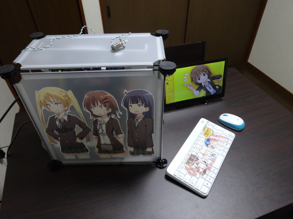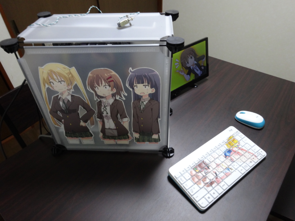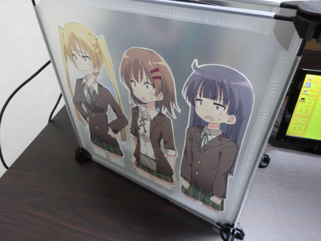 まどらくる ケース前面に投影される踊るプロ生ちゃんより、ケース側面の3人の転写イラストの方がインパクトのある出来栄えになってしまいましたので、電源入れてなくても見た目は楽しいです。低消費電力のの CPU なので、プロ生ちゃんをずっと踊らせても地球には優しいと思います。