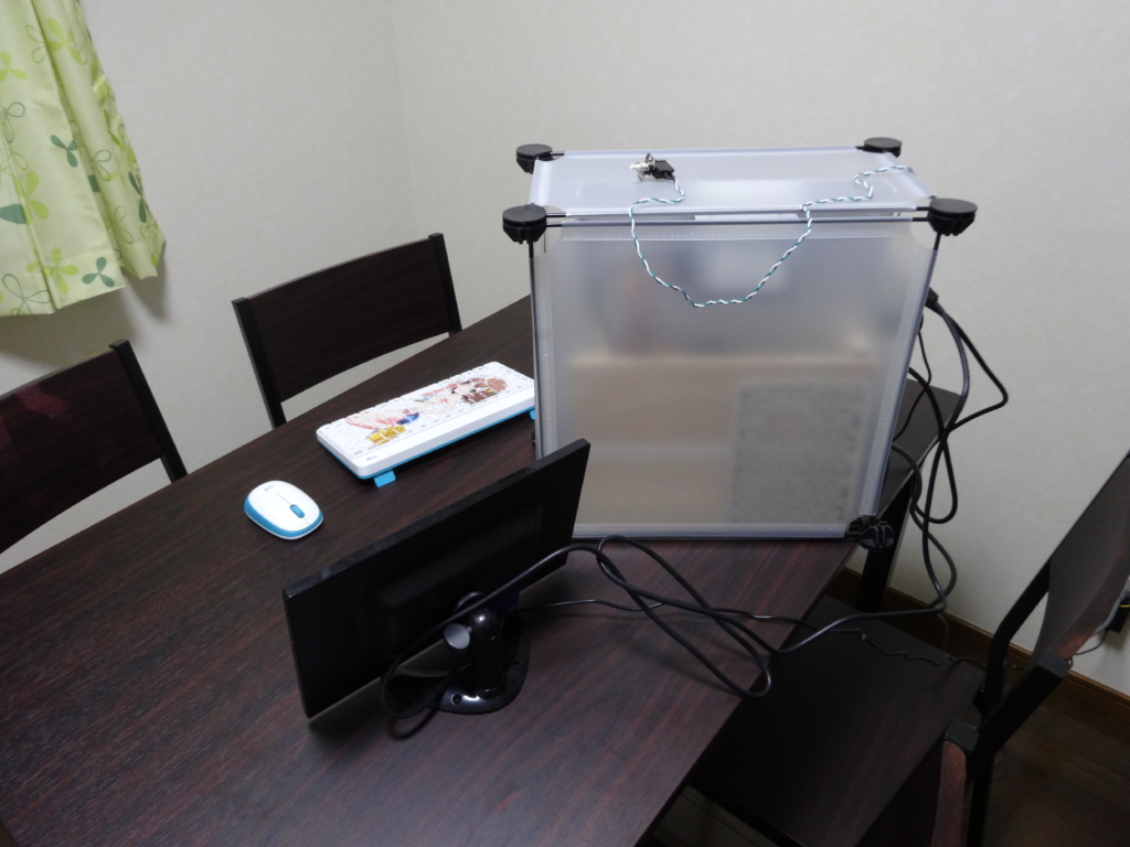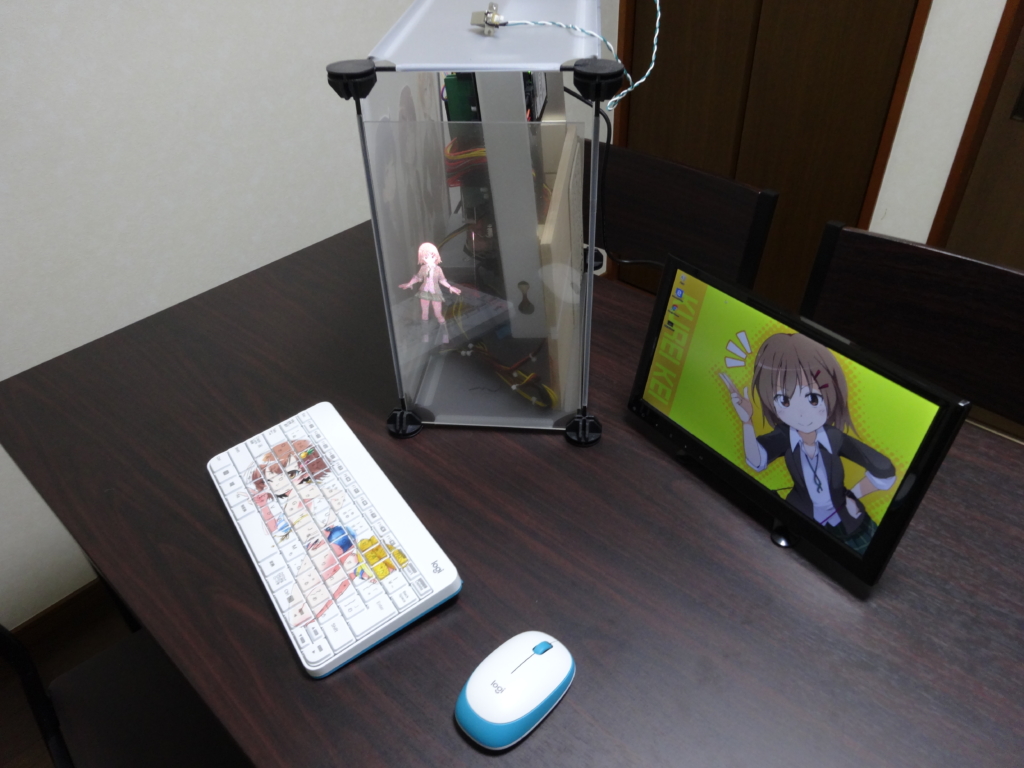 まどらくる 踊るプロ生ちゃんをパソコン本体のみで眺めるためのパソコンです。背面投影スクリーンに小型プロジェクターで映像を投影する方法で、パソコンケースの前面にプロ生ちゃんを表示しています。