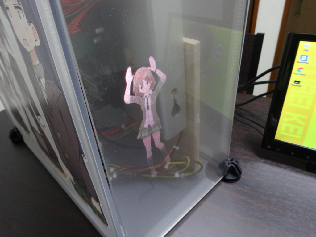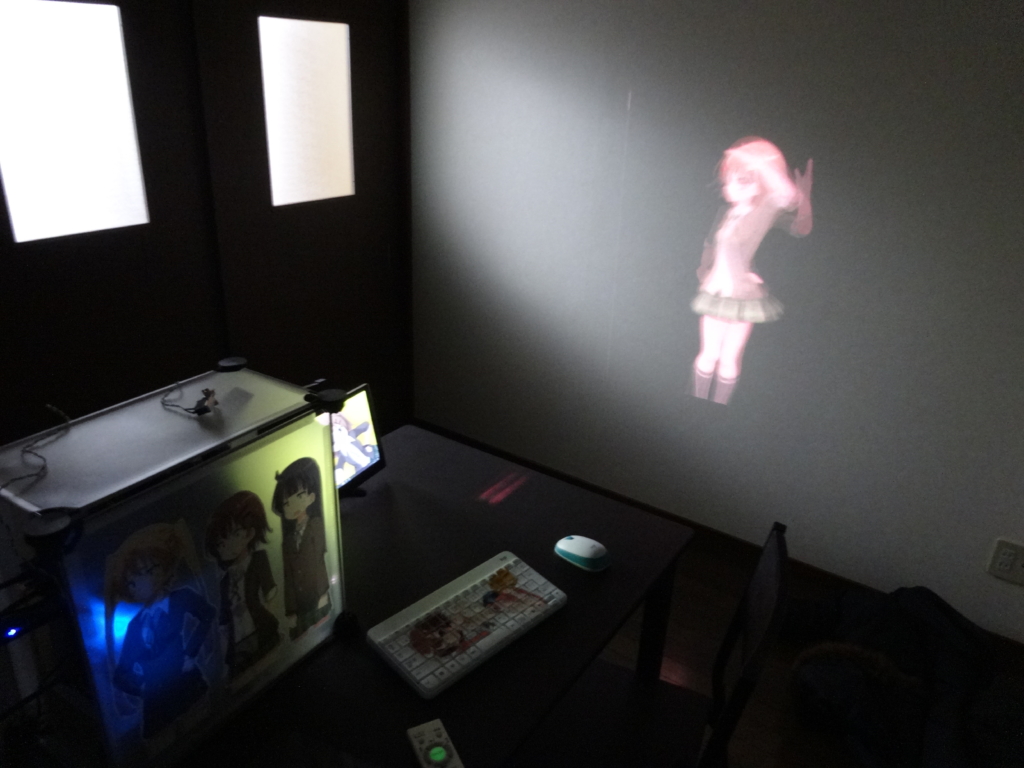 まどらくる 透過液晶でもなく、ハーフスクリーンでもない方法で、プロ生ちゃんをパソコン本体に表示する方法である背面投影式スクリーンとプロジェクターを選択いたしました! 肉眼で見ると結構きれいなんですよ。