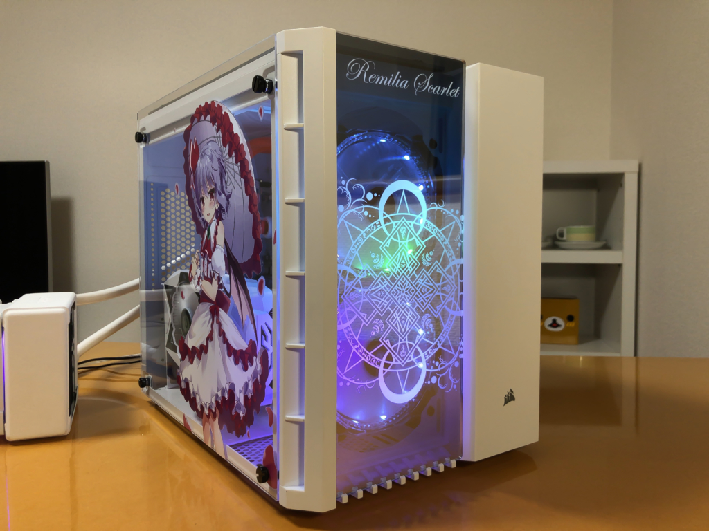 みかんライオン 大好きなキャラクター「レミリア・スカーレット」への愛情を詰め込みつつ、様々なパーツを塗装してホワイトをベースに仕上げました。また、「観て楽しめる」と「使って楽しめる」ふたつの遊び心をギミックとして搭載しています。LAN パーティにも持ち込みやすいよう MicroATX のケースで作成しました。