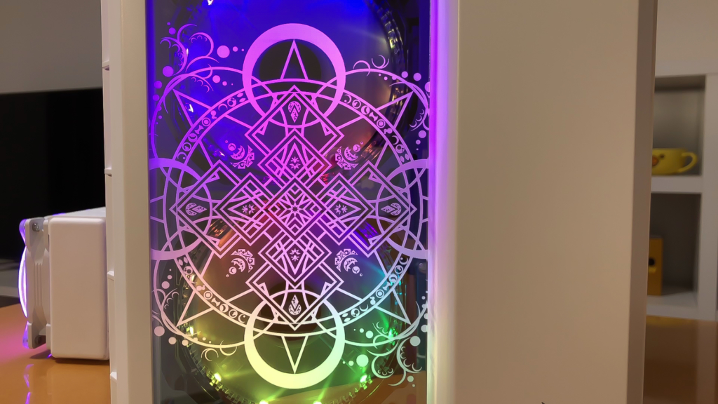 みかんライオン ひとつ目はケースパネルです。フロント、トップ、左サイド、右サイドを既製品から作り変え様々な角度から楽しめるよう、キャラクターのイメージに合わせてデザインにしました。特に左サイドパネルは、絵師の方と何度も調整した最高のイラストをずっと綺麗なまま飾れるように、ツヤや発色、耐久性に優れる「UV 塗装」で作成しました。