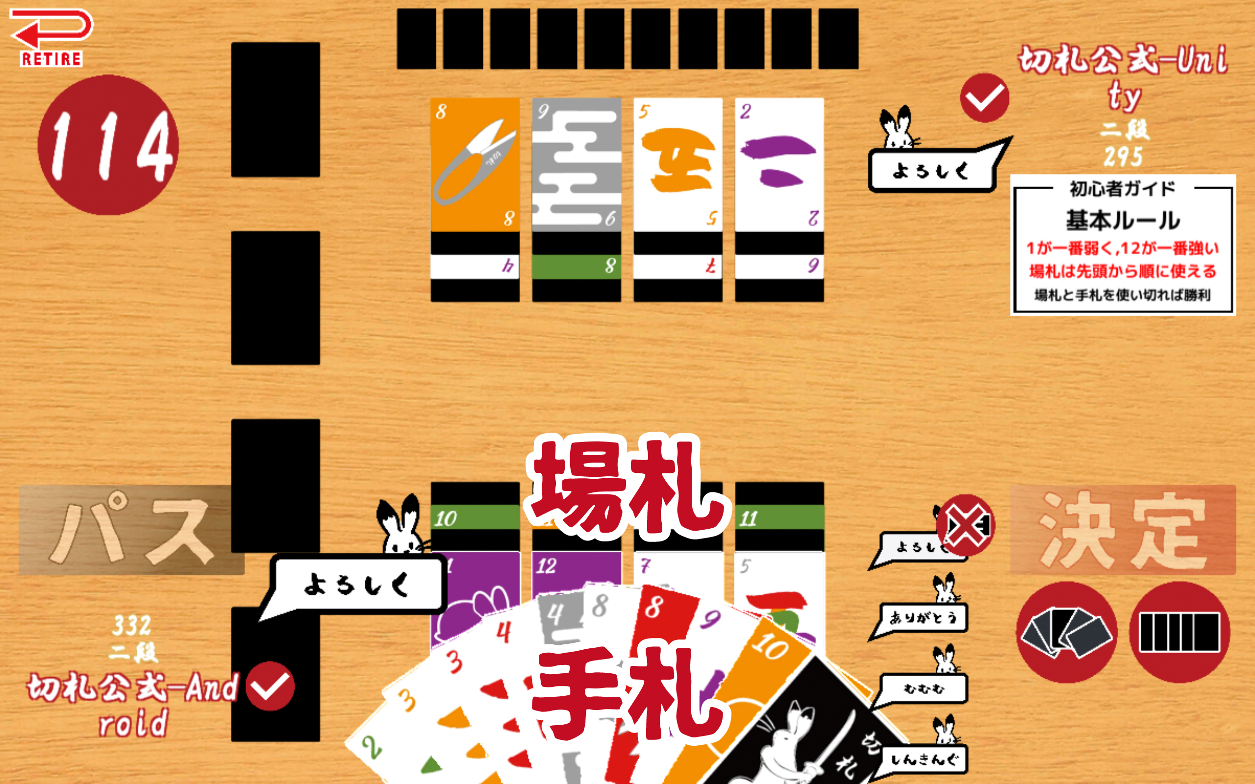 基本的なルールは大富豪と同じですが、通常とは異なり、1が一番弱く、12が一番強いのが特徴です。手札は相手に見えませんが、場札は相手からも確認できるため、場札の活用が勝利への鍵となります。